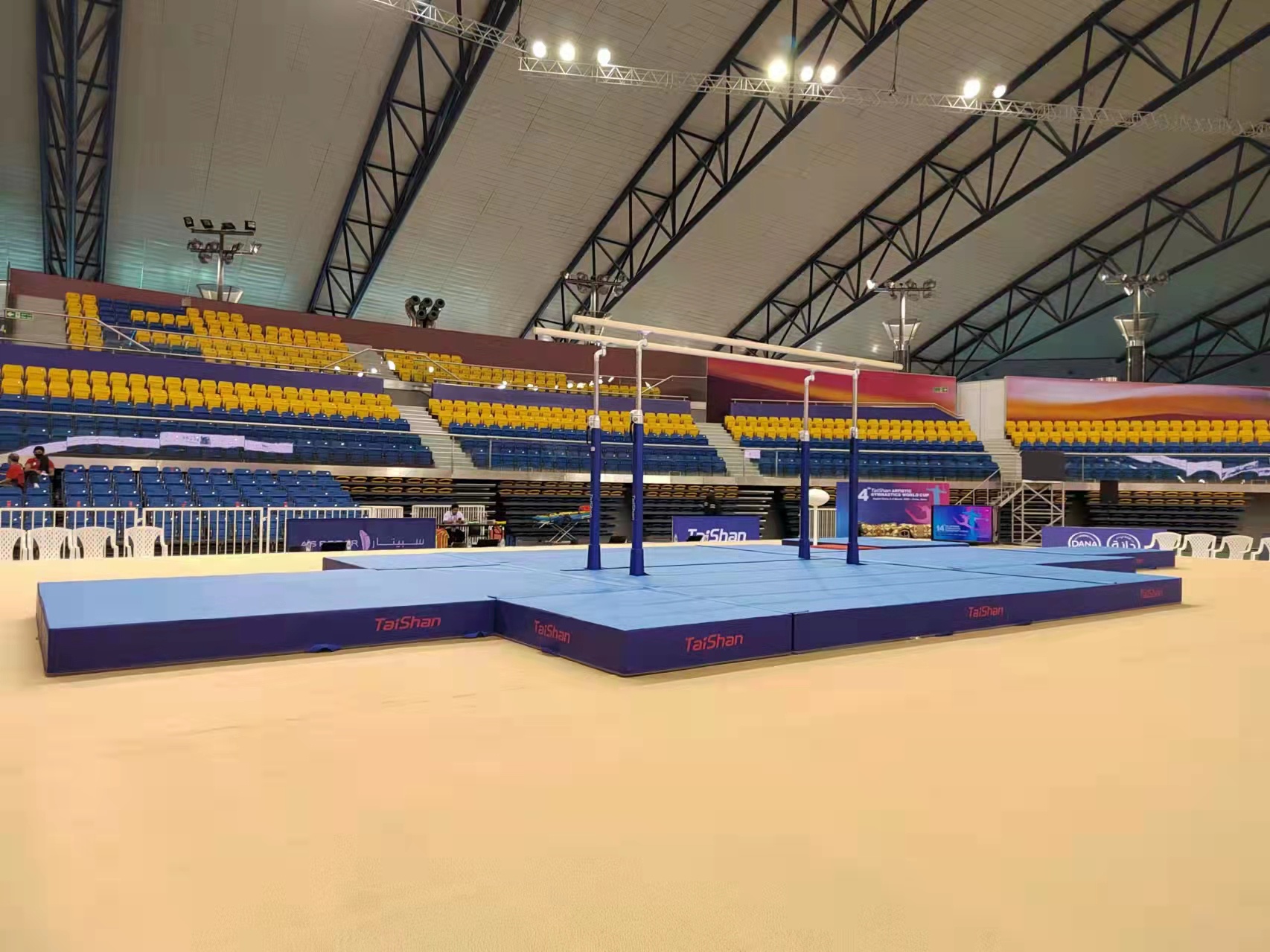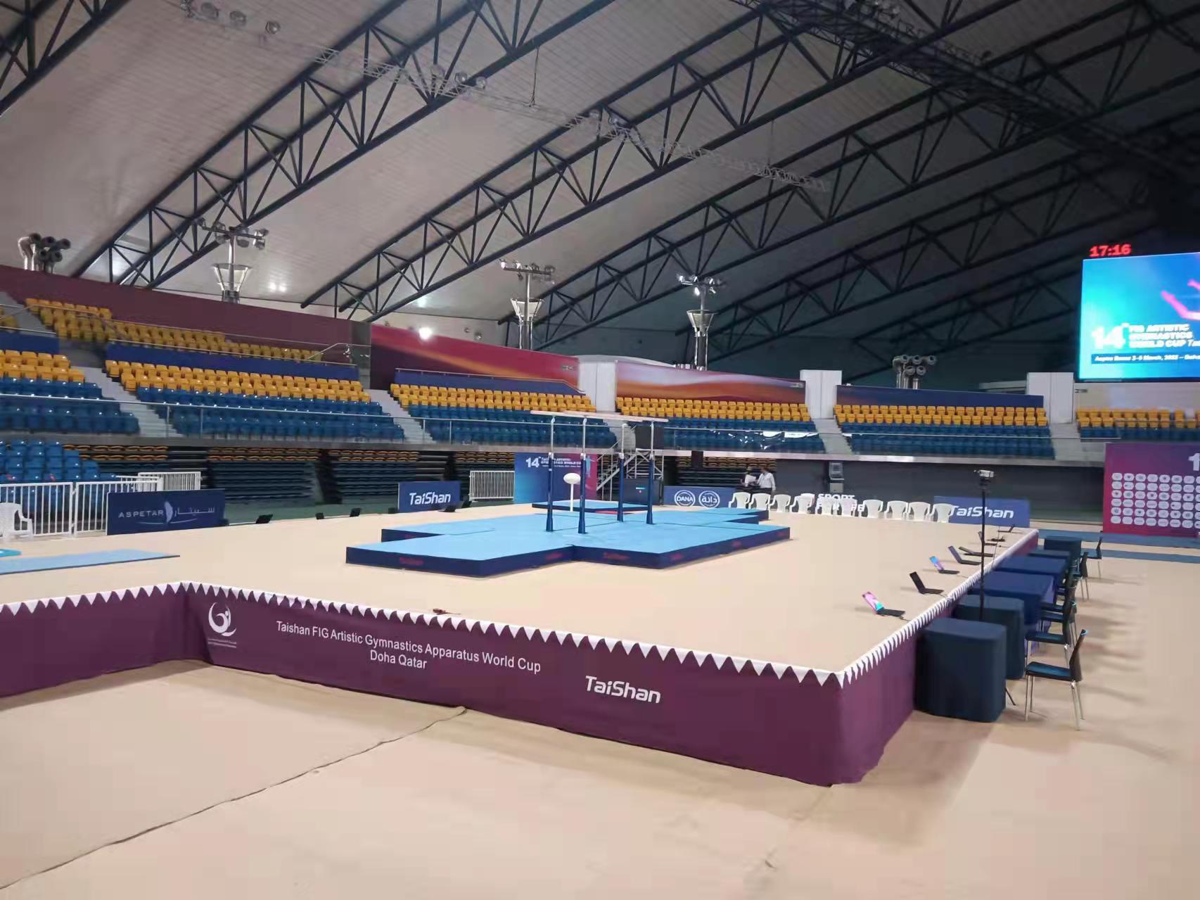 为保障运动健儿的出色发挥,bwin·必赢派出了经验丰富的专业服务团队,于2月22日出发,到达多哈后,队员们不辞辛劳,马上投入到技术指导和安装工作中,并按计划于2月28日圆满完成男子训练馆、女子训练馆、竞赛馆等场馆的安装、调试工作。