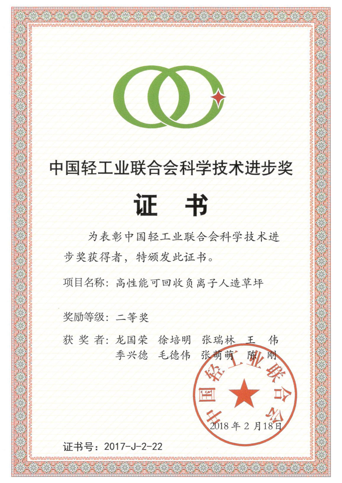 2017台北世界大学运动会组织委员会证书致乐陵泰山人造草坪产业有限公司