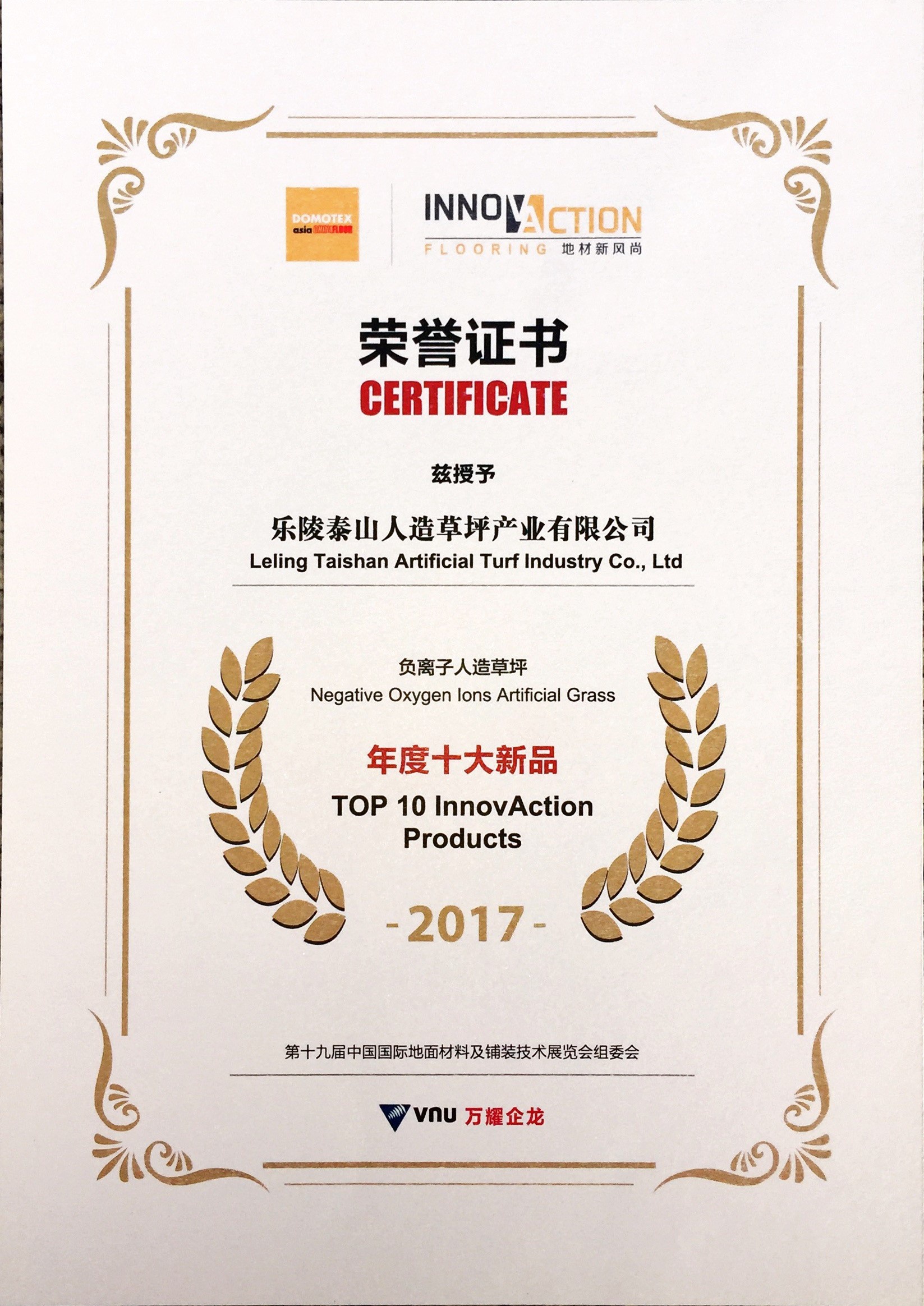 乐陵泰山人造草坪产业有限公司负离子人造草坪年度十大新品2017